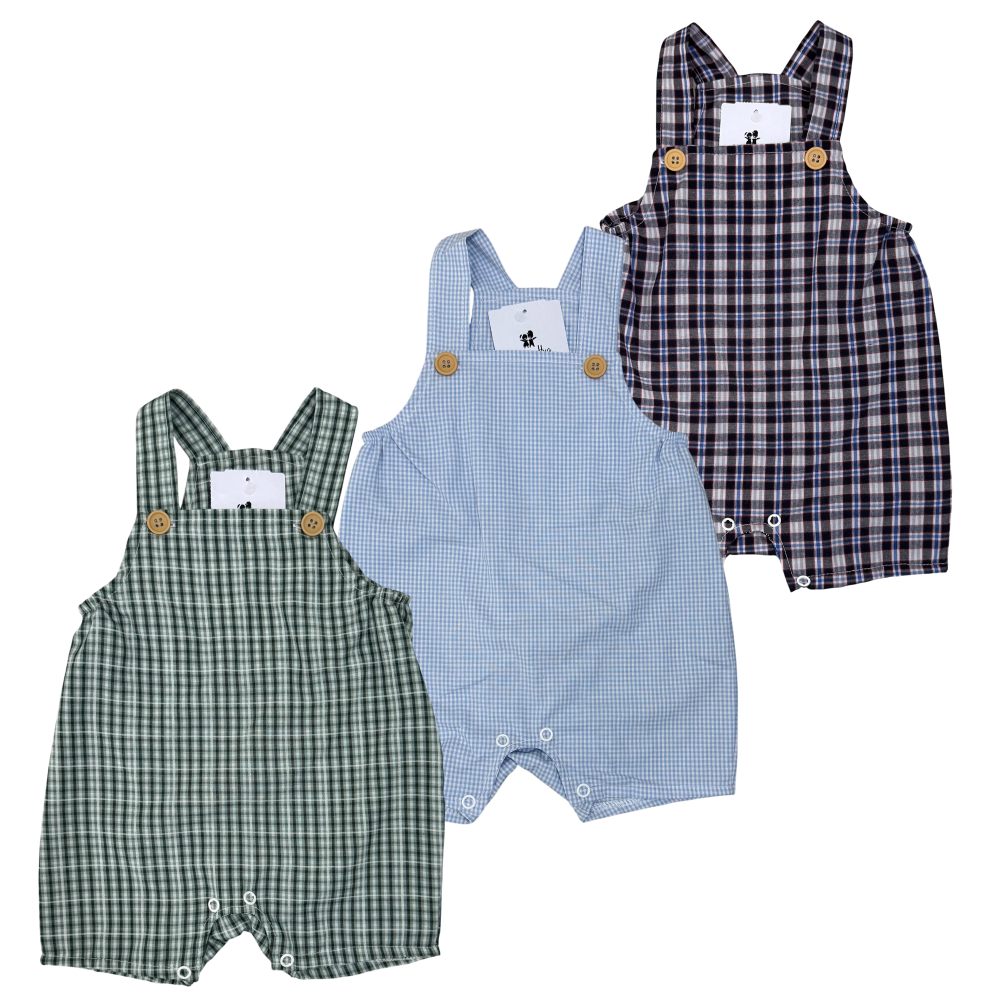 Jardineira tipo banho de sol, abertura das alças em botões, e abertura no entre pernas com botão de pressão. Disponível em lindas estampas xadrez e padrões!